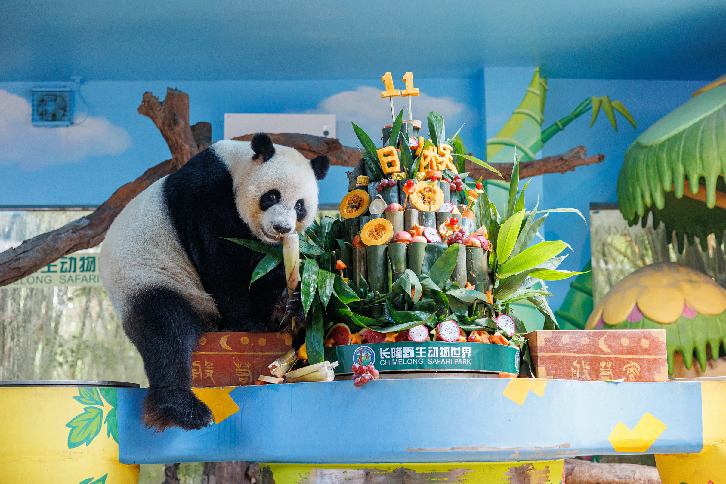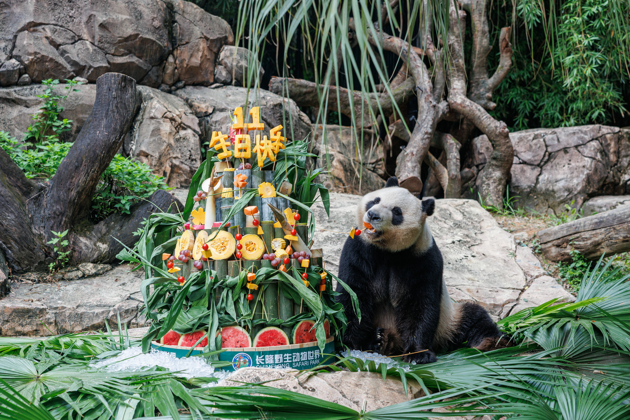 在温馨的生日歌声中,大熊猫“萌萌”“帅帅”“酷酷”各自悠闲开启生日丰容蛋糕“吃播”。保育员陈淑青介绍,特制的生日蛋糕是由蜂蜜水、水果块、竹笋、胡萝卜和竹子等食材制作而成,兼顾健康和美味,深受“老广”大熊猫们的喜爱。陈淑青介绍,长隆野生动物世界还研发了10余种大熊猫专用食谱,与中国竹子研究开发中心合作研发13种广东熊猫专用竹品种,为大熊猫提供适合华南生活的特色饮食,确保它们获得充足的营养。