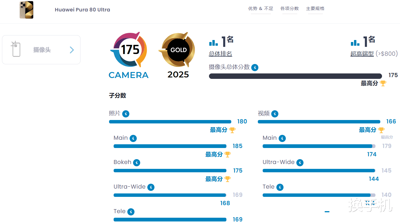 凭借出色的影像表现,Pura 80 Ultra在DXOMARK第六版影像榜单中以175分的成绩荣登榜首,刷新了行业纪录,成为当前影像表现最为出色的手机产品。